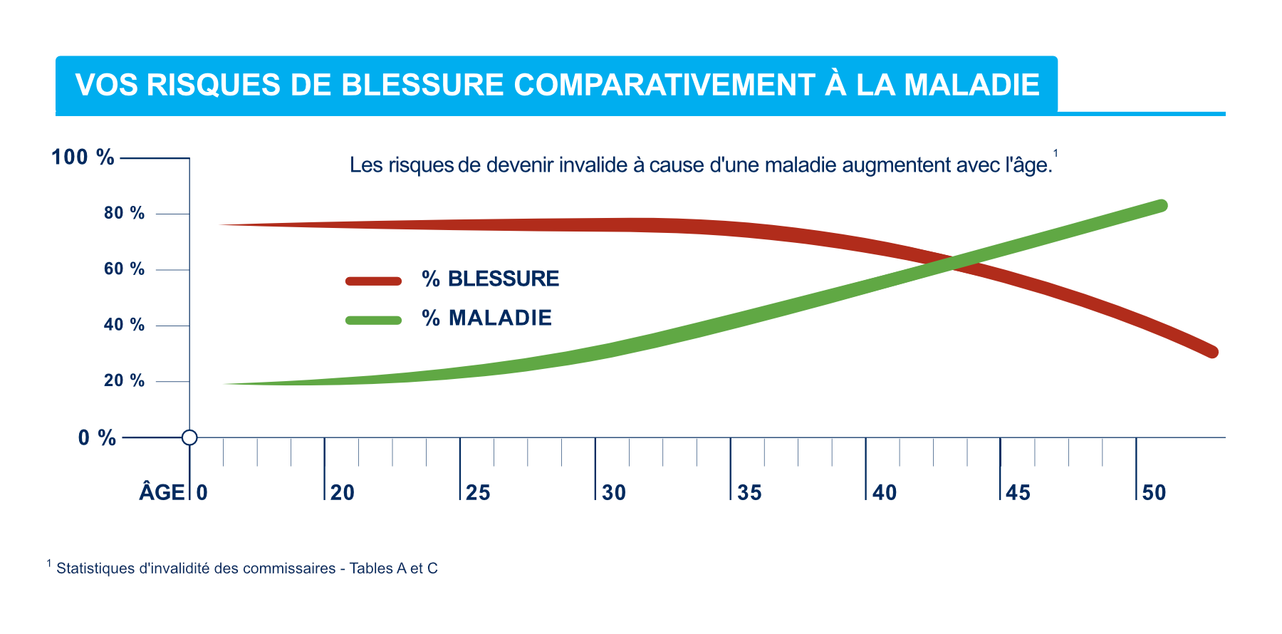 Les jeunes ont plus de temps devant eux pour payer leurs factures, leur loyer ou leur hypothèque. Ils sont également plus susceptibles d’occuper des emplois manuels à haut risque, comme dans la construction ou l’agriculture, où une blessure grave pourrait avoir un impact considérable sur leur capacité à maintenir leur mode de vie ou même à modifier leur potentiel de gain tout au long de leur carrière. Si l’on tient compte du fait qu’à tout moment, 20 % de la population canadienne est touchée par une invalidité qui affecte ses activités quotidiennes, et que le risque d’invalidité due à une maladie augmente avec l’âge, il est logique que toute personne soucieuse de maintenir le revenu familial ait souscrit une telle police afin d’être prête à faire face à l’imprévu.